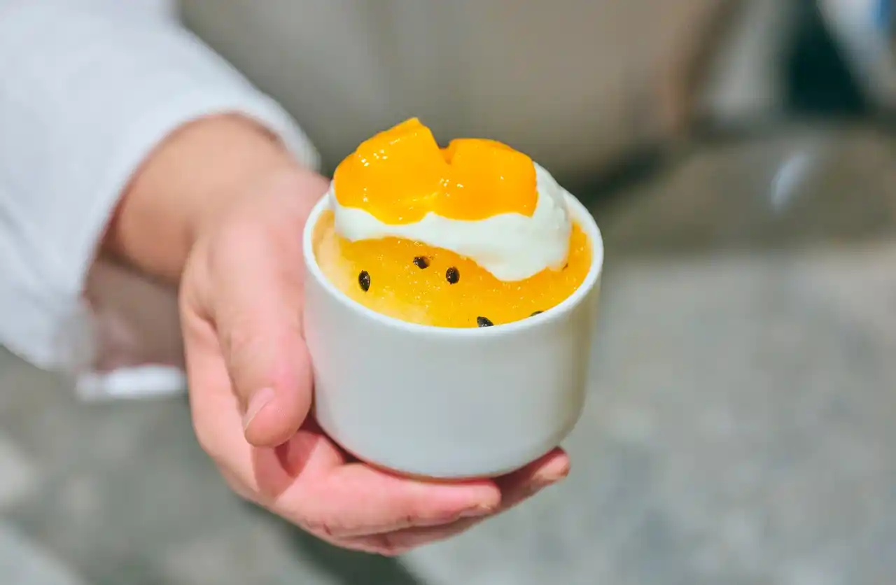 マンゴーに、ココナッツクリームとパッションソースを合わせたかき氷。甘みと酸味のバランスが心地よい、さっぱりとした味わいです。 |