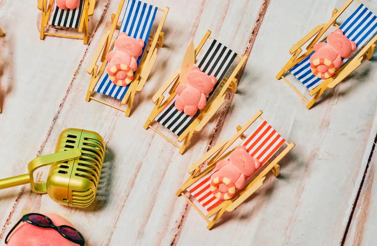 愛らしいベアモチーフに仕立てた、 桃とハイビスカスのムース。フルーツと花がやさしく調和します。 |