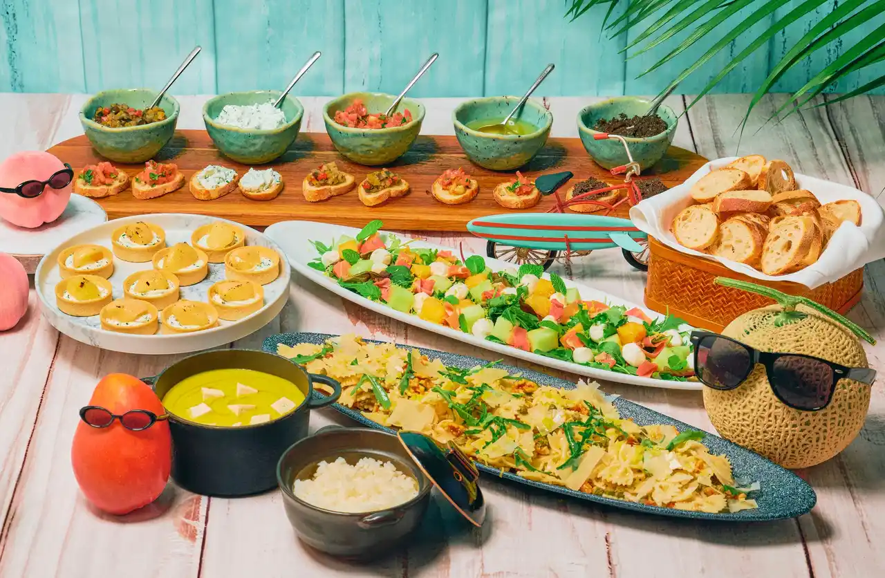 この夏、オールデイダイニング「Teori(テオリ)」がサマーフルーツたちのステージに!旬のフルーツが放つ瑞々しさ、弾けるようなジューシーさ、そして舌の上でとろけるなめらかな口どけ、その魅力を余すことなく表現するサマースイーツビュッフェでは、ショート ケーキやタルトといった定番スイーツはもちろん、ここでしか味わえないオリジナルスイーツが勢ぞろい。一つひとつのスイーツがまるでアイドルのようにスポットライトを浴び、ビュッフェラインで眩しく輝きます。 |