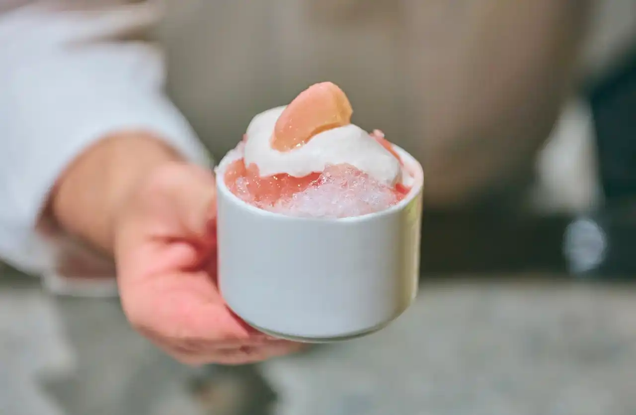ピーチに、香り豊かなバニラクリームと、甘酸っぱいベリーソースを重ねたかき氷。果実のやさしい甘みと華やかな酸味が調和する、上品な味わいをお楽しみください。 |