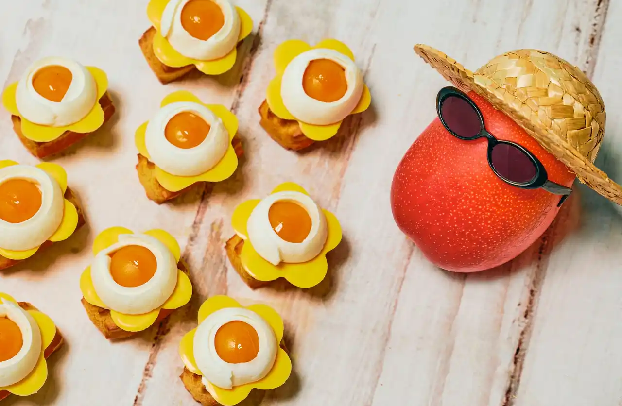 マンゴーとココナッツのエクレア 完熟マンゴーの濃厚な甘みと、ココナッツのやさしい香りを閉じ込めたエクレア。軽やかに焼き上げたシュー生地に、たっぷりのマダガスカル産バニラクリームを忍ばせ、夏に心地よいすっきりとした後味に仕上げました。 |