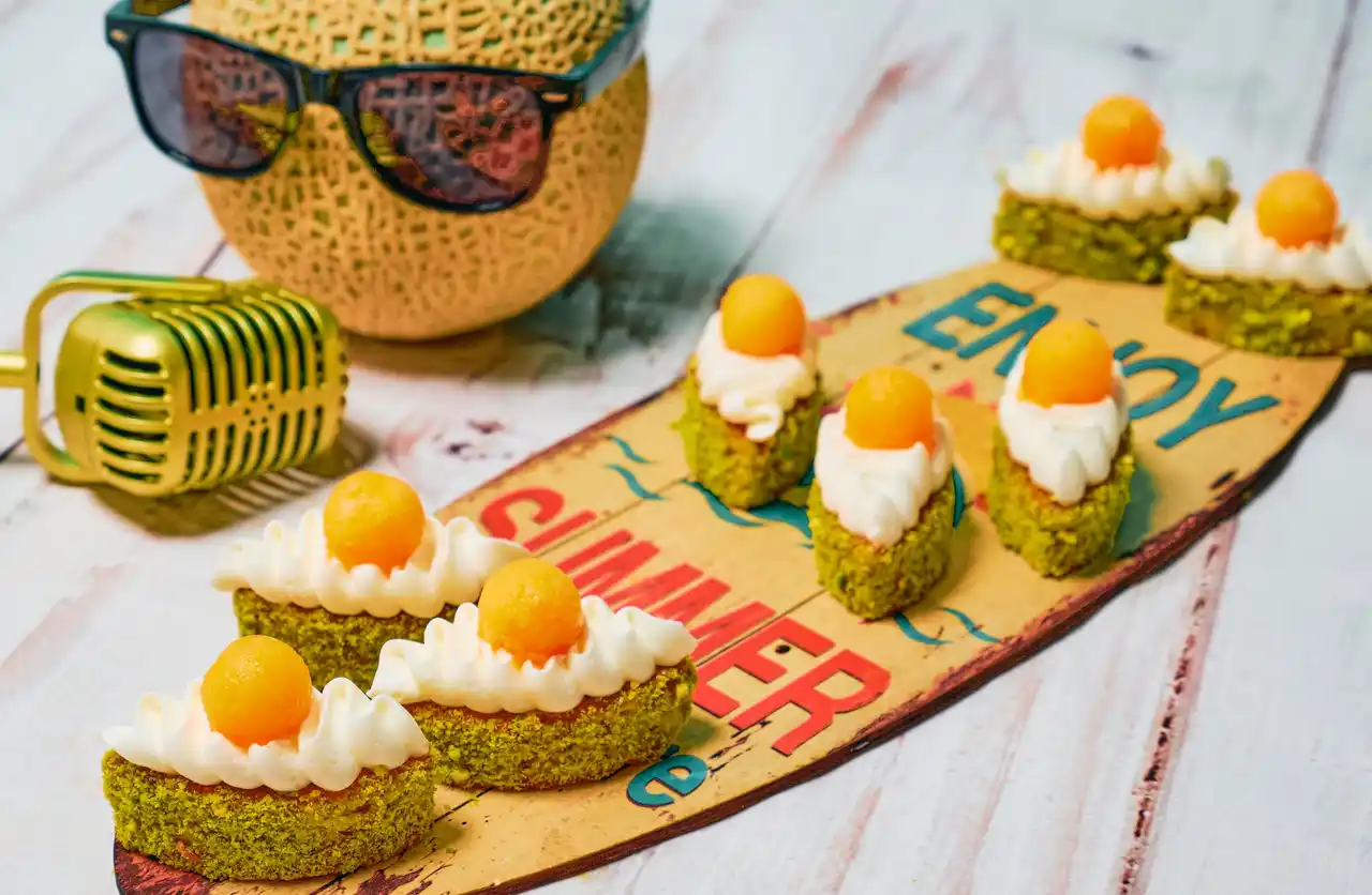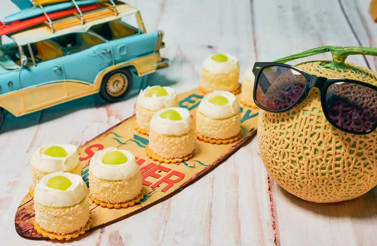 ココナッツの香り豊かなシフォンケーキに、爽やかなメロンの甘みをプラス。軽やかな食感と、夏らしいフルーティーな余韻をお楽しみいただけます。 |