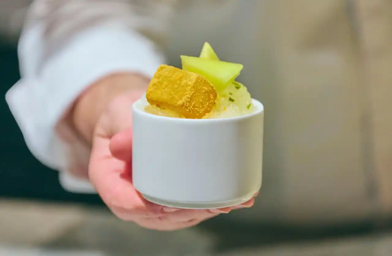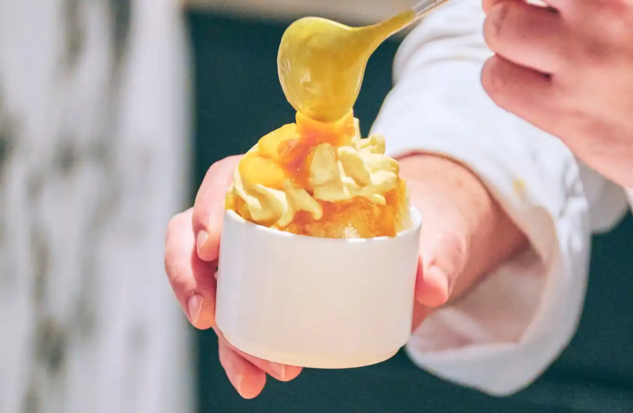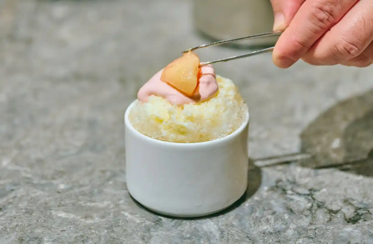 メロンの甘みを、フロマージュブランクリームのコクと、ゆずソースの清涼感が引き立てるかき氷。爽やかで洗練された味わいが広がります。 |