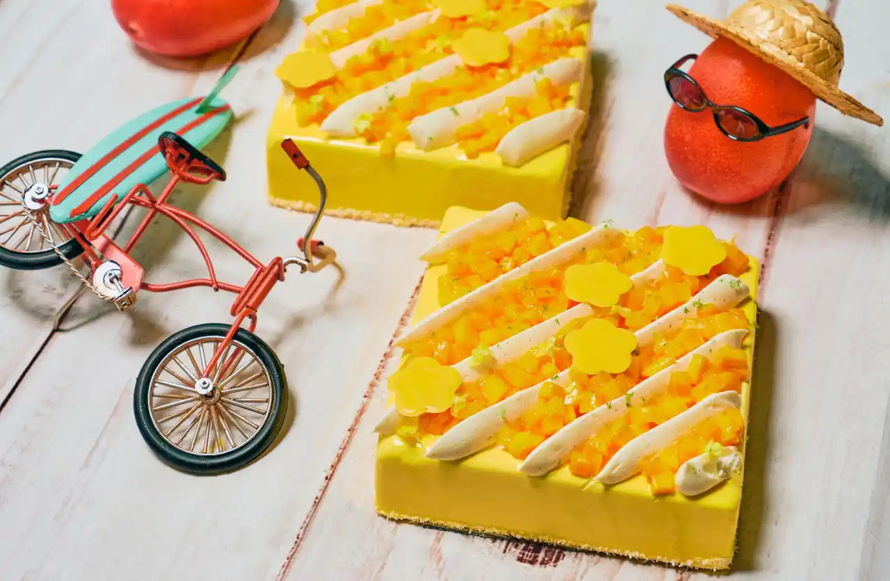 ブルーベリームースに、マンゴーゼリーを重ね、マンゴー風味のマドレーヌビスキュイで軽やかに仕上げました。果実のハーモ ニーが際立つ爽やかな味わいをお楽しみいただけます。 |