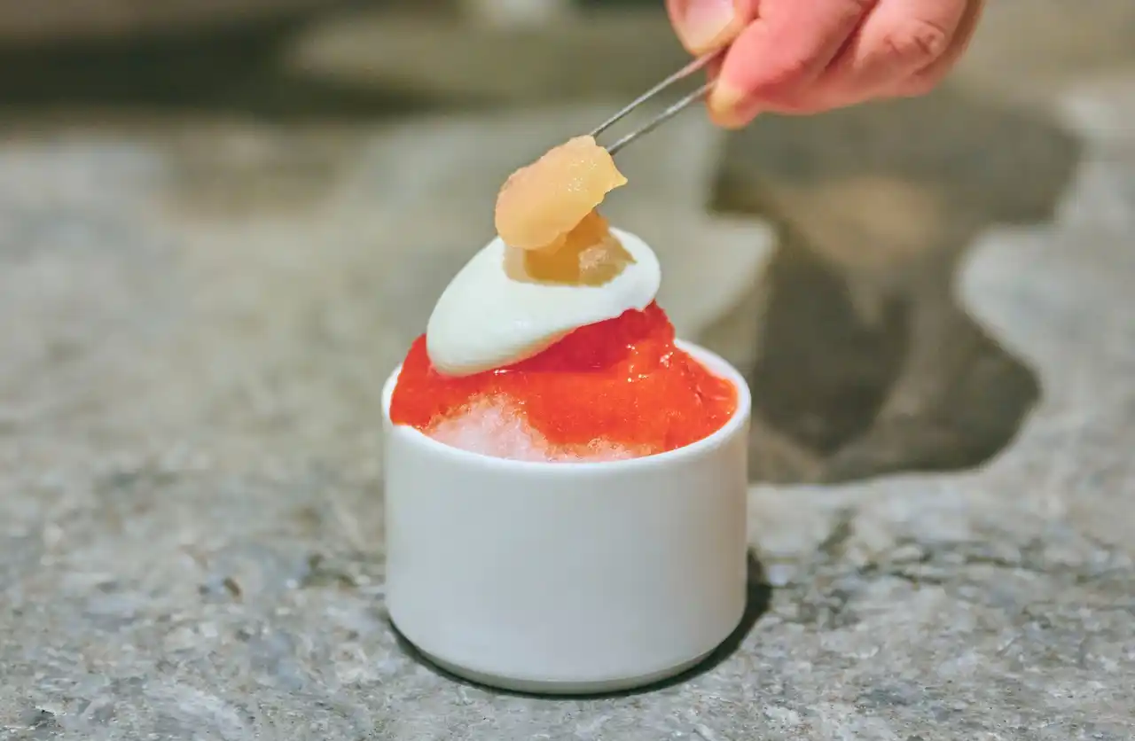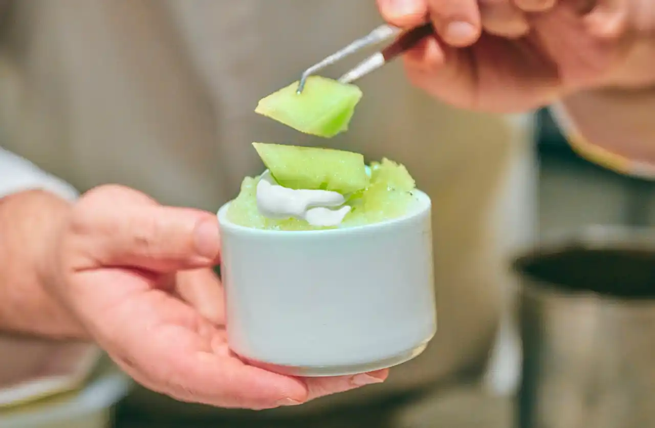 メロンに、もっちりとしたわらび餅、爽やかな香りのシソソースを合わせたかき氷。和の要素を取り入れた、すっきりとした味わいが夏に心地よい一品です。 |