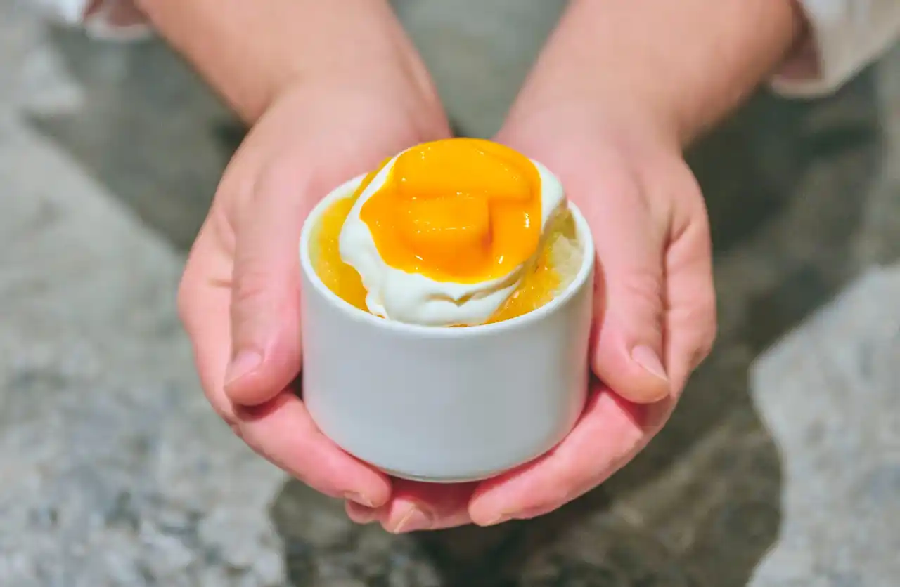 マンゴーに、爽やかなヨーグルトクリーム、濃厚なマンゴーソースを重ねたかき氷。果実の甘みとほどよい酸味が調和する、夏にぴったりの一品です。 |