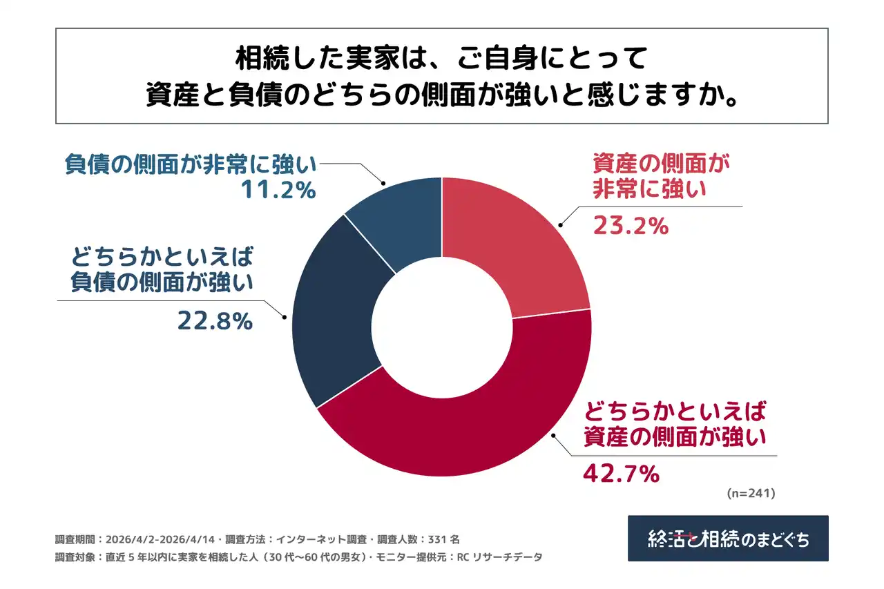 ・直近5年以内に実家を相続し現在も何らかの形で所有している人の65%以上が、その実家は自身にとって負債よりも「資産の側面が強い」と感じている |