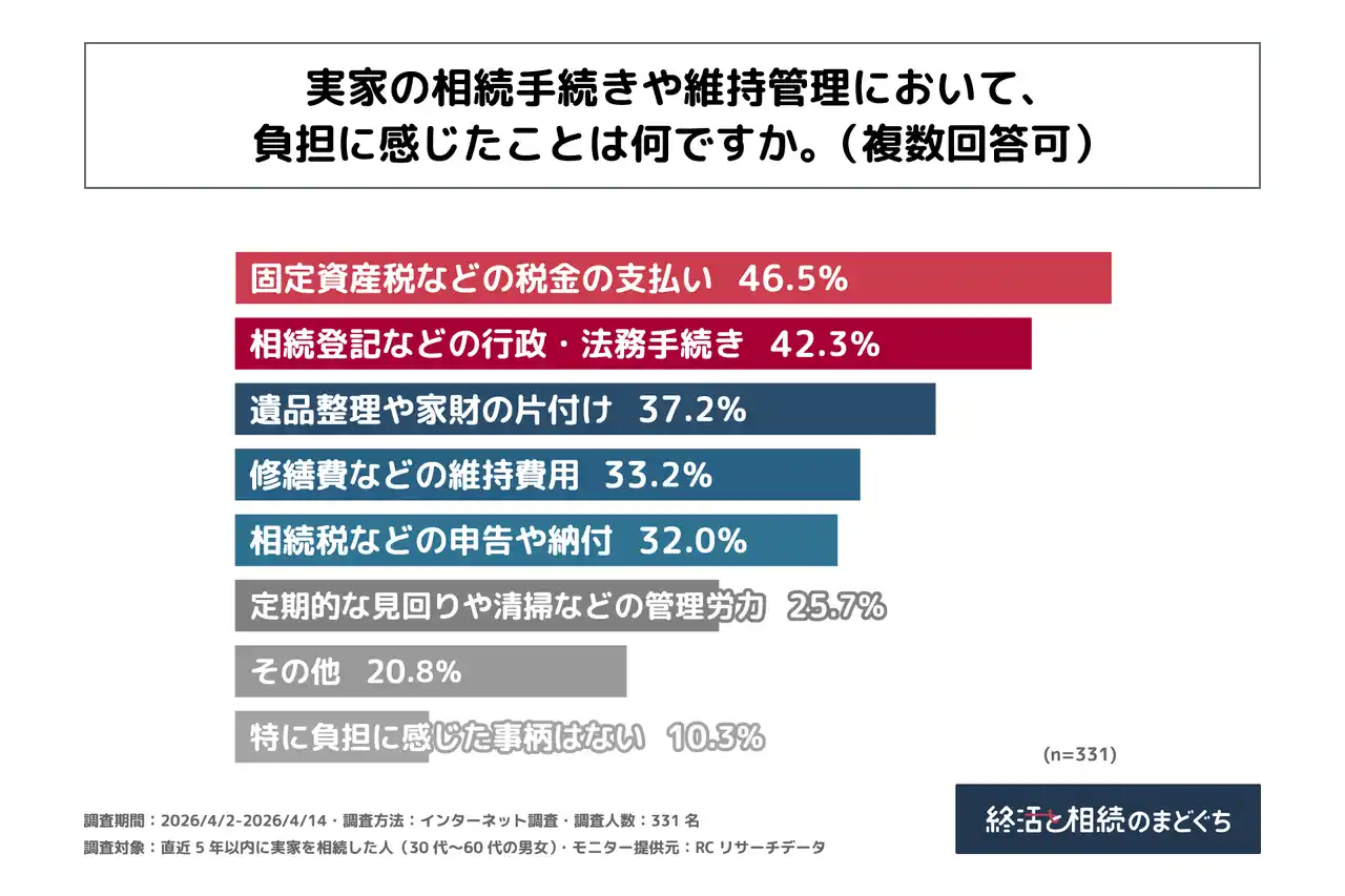 直近5年以内に実家を相続した人がその手続きや維持管理において主に負担に感じたことは、「固定資産税などの税金の支払い」や「相続登記などの行政・法務手続き」 |