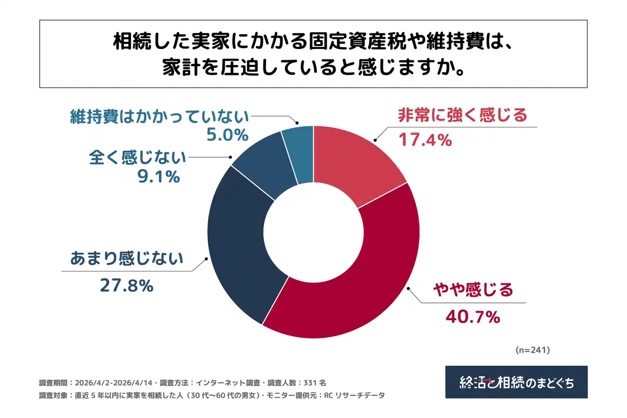 直近5年以内に実家を相続し現在も何らかの形で所有している人の約6割が、その実家にかかる固定資産税や維持費が家計を圧迫していると感じている |