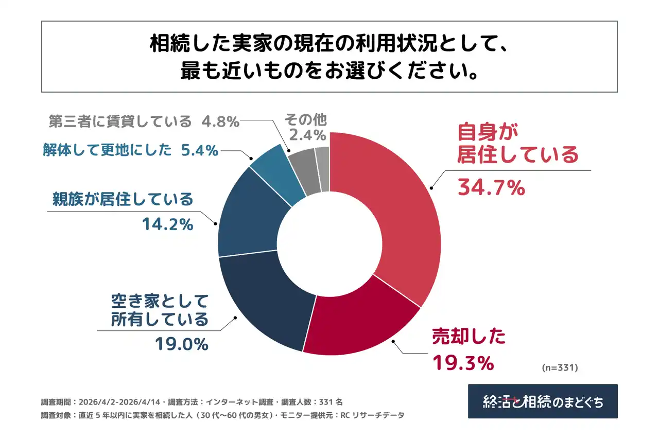 直近5年以内に実家を相続した人の現在の実家の利用状況のトップ3は、1位「自身が居住している」、2位「売却した」、3位「空き家として所有している」 |