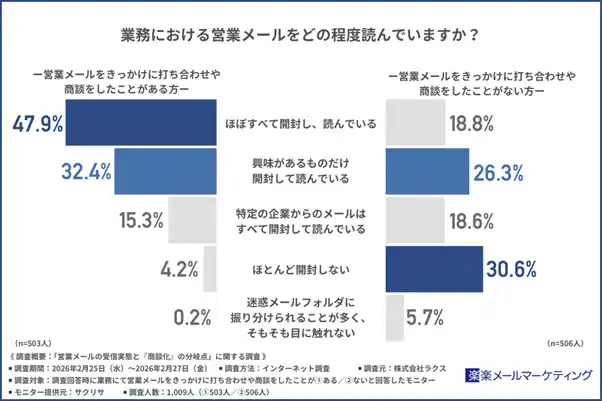 打ち合わせ・商談経験者の約半数が営業メールを「ほぼすべて読んでいる」、一方未経験者は約3割が「開封しない」。営業メールへの受容姿勢に明確な差 |