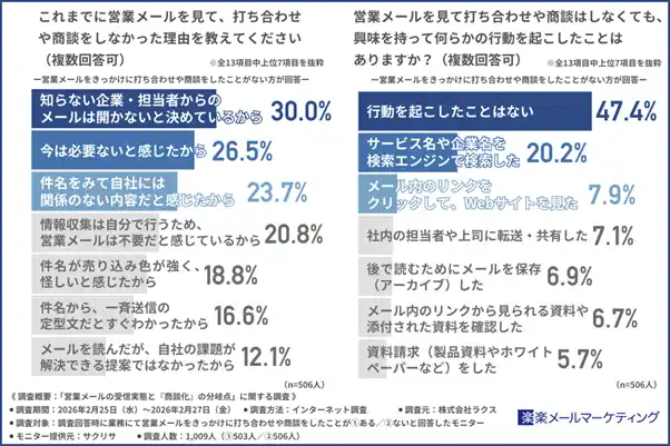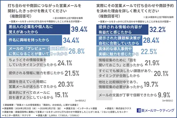 株式会社ラクス(本社所在地:東京都渋谷区、代表取締役:中村 崇則)が提供するメールマーケティングサービス「楽楽メールマーケティング」(旧名称:配配メール)は、業務にて営業メールをきっかけに打ち合わせや商談をしたことがある方とない方を対象に「営業メールの受信実態と『商談化』の分岐点」に関する調査を実施しました。 |