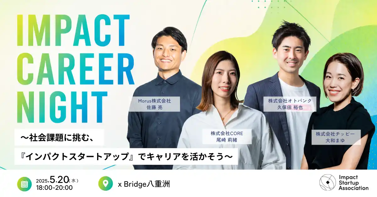 「社会課題の解決」と「持続可能な成長」を両立させ、ポジティブな影響を社会にもたらすことを目指すインパクトスタートアップ協会(Impact Startup Association 、以下 ISA)は、2026年5月20日(水)18時30分より、キャリアイベント「IMPACT CAREER NIGHT ~社会課題に挑む、『インパクトスタートアップ』でキャリアを活かそう~」を、X Bridge Yaesu(東京都・中央区)にてオフライン限定で開催します。 |