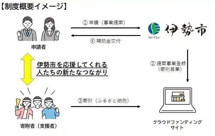 | 伊勢市の活性化や地域課題解決につながる新しい事業(取組)について、クラウドファンディング型ふるさと納税で募った寄附金をもとに、事業(取組)にかかる経費の一部を補助します。 | |||