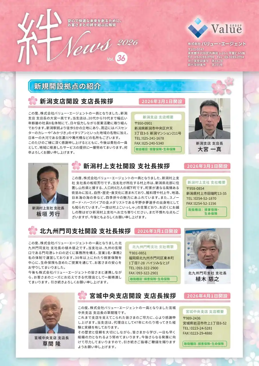 『絆ニュース』は、「安心で快適な未来を創るために。お客さまとの絆を結ぶ広報誌」として発行しているグループの広報誌です。Vol.36では、2026年3月~4月に新たに開設した4拠点の紹介を中心に、新卒社員の紹介や全国40拠点の最新マップ、取扱金融機関一覧など、バリュー・エージェントの“今”を凝縮した内容となっています。 |
