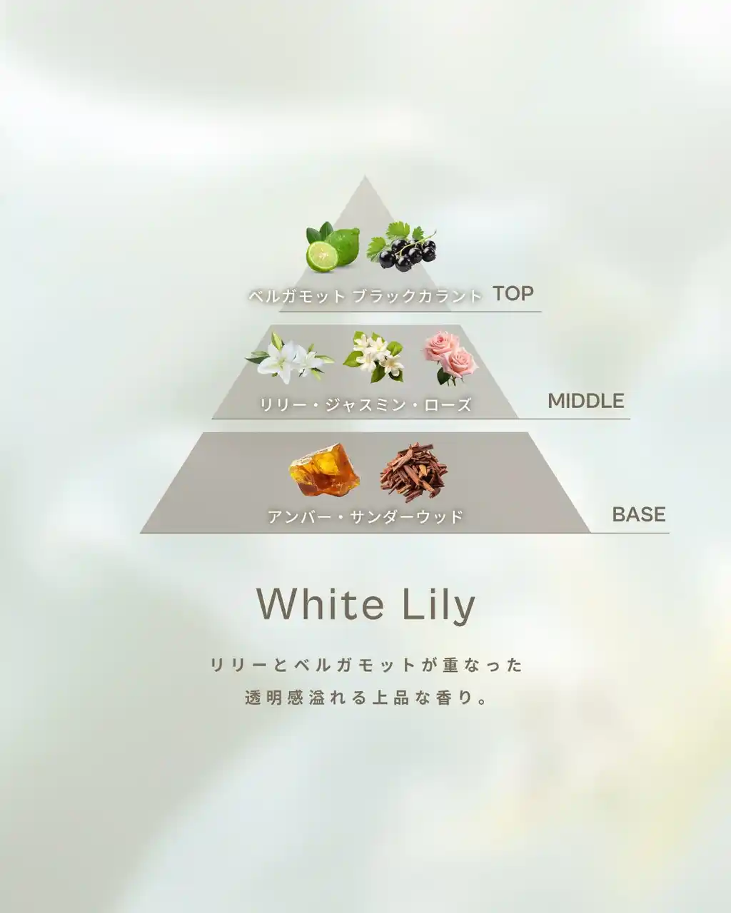 | 新たに登場する「ホワイトリリー」は、華やかさの中に清らかさを感じるフローラルブーケの香りです。 | |||||||||||