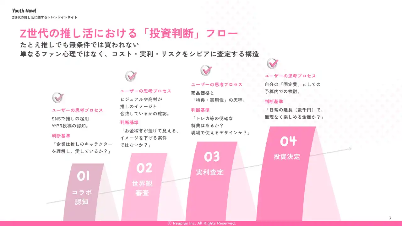 株式会社Reaplus[リアプラス](本社:東京都渋谷区、代表取締役:松元 詞音)は、若年層インサイトを可視化するマーケティングサービス「Youth Now!」にて、Z世代を対象に「推し活および企業コラボに関する定性調査」を実施いたしました。 |