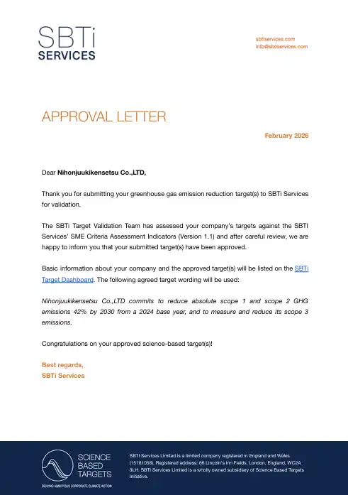 この度、本サービスを通じて日本ジュウキケンセツ株式会社(以下「同社」という)がGHGプロトコル(※2)にもとづき自社の温室効果ガス排出量となるScope1、Scope2(※3)を算定し、掲げた削減目標がSBT(※4)認定(中小企業向け)を取得しましたのでお知らせします。 |