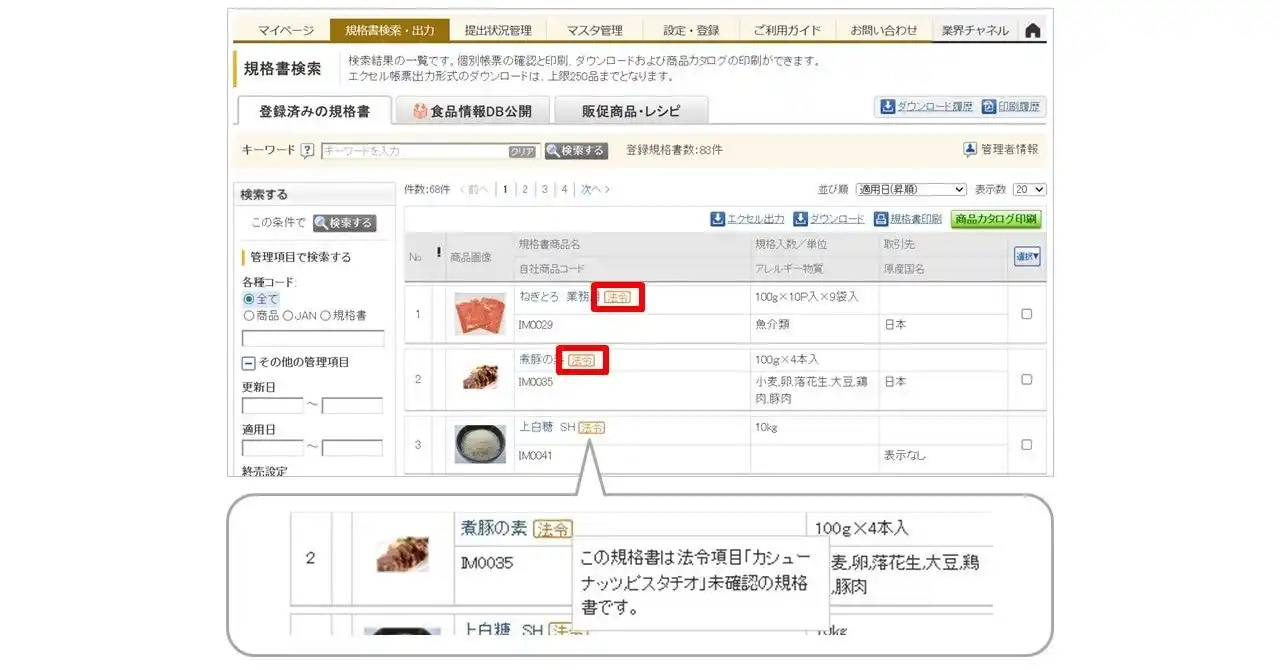 検索画面上で、新基準への対応(規格書の確認・提出)が完了していない商品に「法令」アイコンが表示されます。さらにアイコンにマウスを合わせると、カシューナッツ・ピスタチオのどちらが未対応かを判別可能です。確認が必要な商品が視覚的に強調されるため、管理ミスや更新漏れを未然に防ぎます。 |