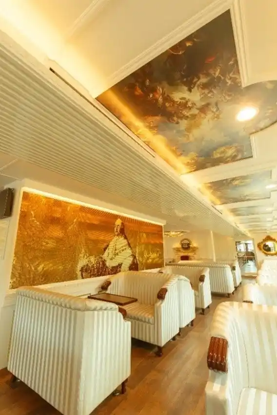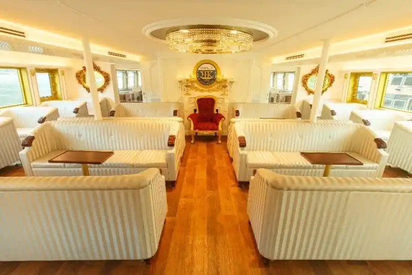 プラス800円でご利用いただける座席定員制の特別船室では、各船のコンセプトに合わせた歴史や文化を感じさせる装飾が施されており、広々としたお座席や眺めの良い前方部分の専用デッキなどで、優雅な非日常のひと時をお過ごしいただけます。 |