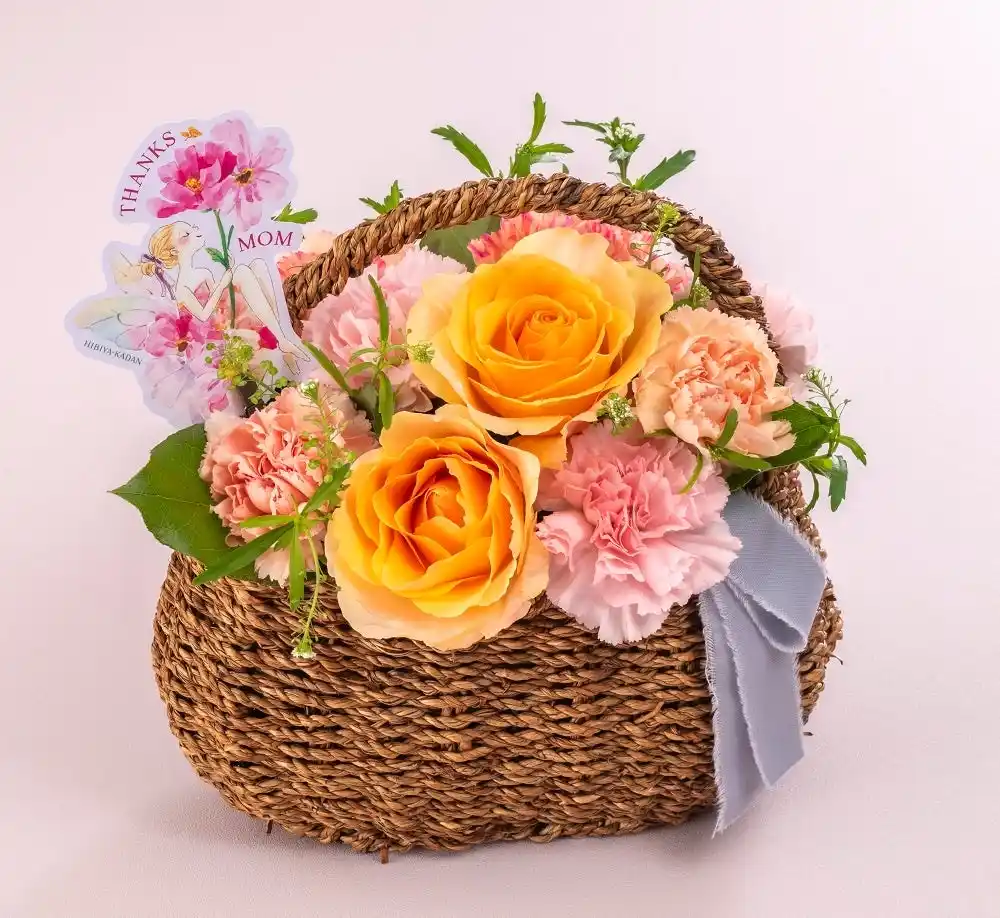 陽だまりのようなやさしい彩りの花々を、妖精がそっと摘んできたかのようなバスケットアレンジメント。 |