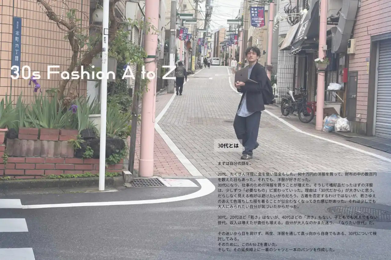 洋服にまつわる言葉や感覚を、AからZまでのキーワードで編集。 「若さ」と「渋さ」のあいだで揺れる30代の洋服選びについて、写真と言葉で掘り下げています。 |