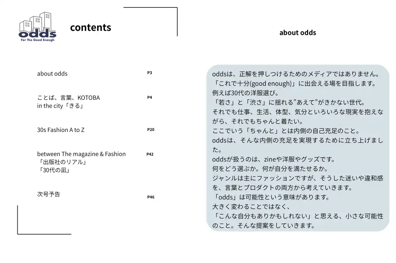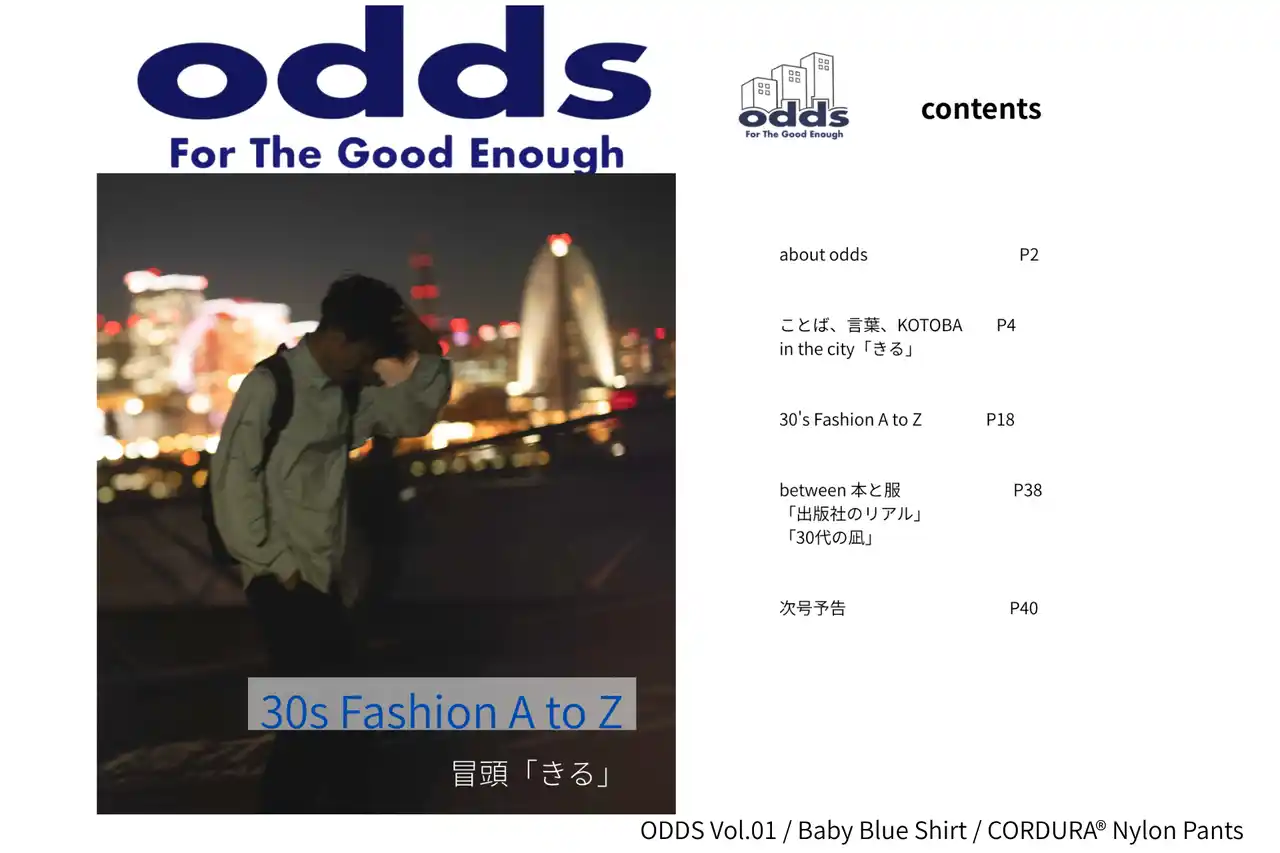 | 『ODDS Vol.01』は、「30代のためのファッション A to Z」をテーマにしたZINEです。 | |||