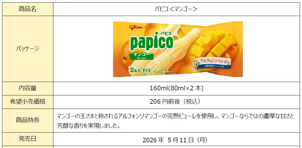 江崎グリコ株式会社は、2026 年 5 月11日(月)より「パピコ<マンゴー>」を全国で新発売します。マンゴーの王さまと称される完熟アルフォンソマンゴーピューレを使用し、マンゴーならではの濃厚な甘さや芳醇な香り、なめらかな食感が特長です。