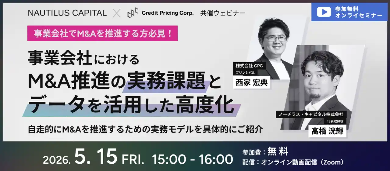 株式会社クレジット・プライシング・コーポレーション(代表取締役社長:鈴木 洋壹、本社:東京都中央区、以下CPC)は、ノーチラス・キャピタル株式会社(代表取締役:高橋 洸輝、本社:東京都千代田区、以下ノーチラス・キャピタル)との共催で、2026年5月15日(金)に事業会社のM&A担当者向けウェビナー「事業会社におけるM&A推進の実務課題とデータを活用した高度化」をオンラインにて開催します。参加費は無料です。 |