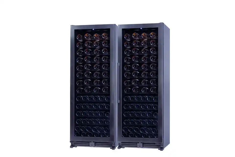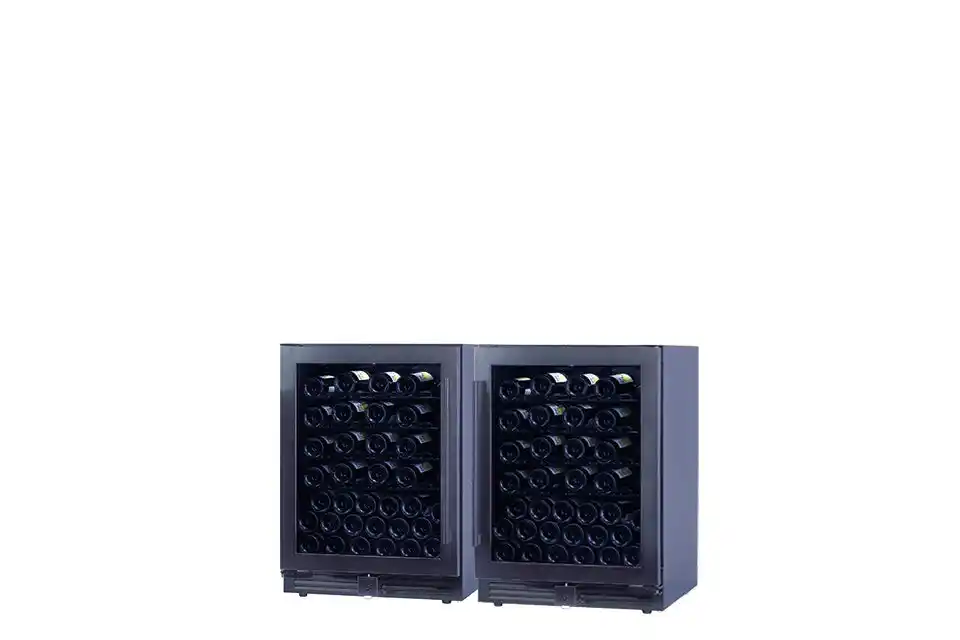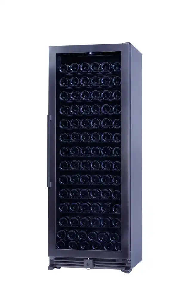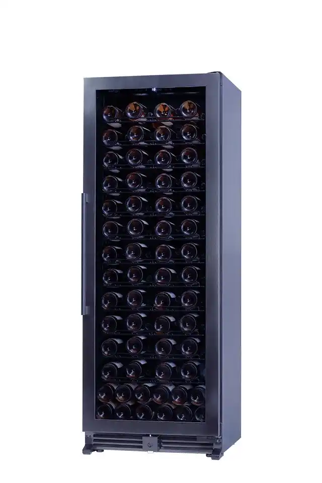 奥行約53cmの薄型設計により、通路やバックヤードなど限られたスペースにも設置しやすい、84~108本収納の1温度帯ワインセラーです。 |
