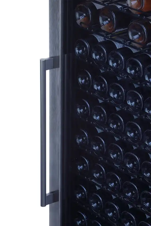 薄型設計ながら、ブルゴーニュタイプのボトルのみの場合は最大約108本の収納が可能。ボルドータイプのボトルと混在しても、約100本前後のワインを効率よく収納できます。 |