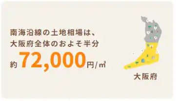 たとえば、南海沿線エリアの土地相場は、大阪府全体のおよそ半分(約72,000円/平方メートル )とされ、住居費を抑えながら選択肢を広げやすい点が特徴です。また、沿線各地には新鮮な野菜や果物を扱う直売所が約45か所、朝市などで鮮魚を購入できる漁港が12か所あり、気軽に新鮮な食材を手に入れることができる環境が整っています。 |