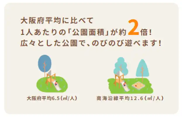 子どもが身近に自然と触れ合える環境として、100,000平方メートル 以上の大規模公園が約40か所点在しており、1人あたりの公園面積は大阪府平均の約2倍となっています。教育面では、教職員1人あたりの子どもの数が大阪府平均より少なく、より目が行き届きやすい教育環境が整っているエリアです。 |