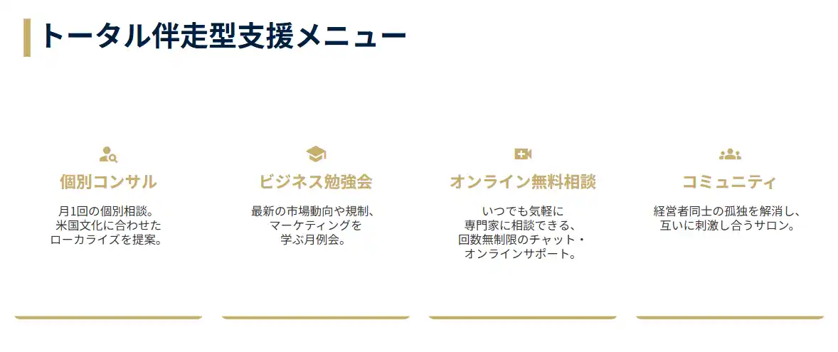 本サービスは、月額15万円から利用可能な伴走型支援モデルであり、商品設計、販売戦略、現地展開、法人設立支援までを一体的にサポートいたします。これにより、企業は過度な投資リスクを抑えながら段階的に米国市場へ進出することが可能となります。 |