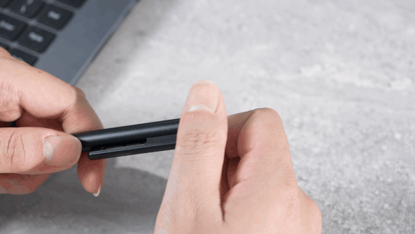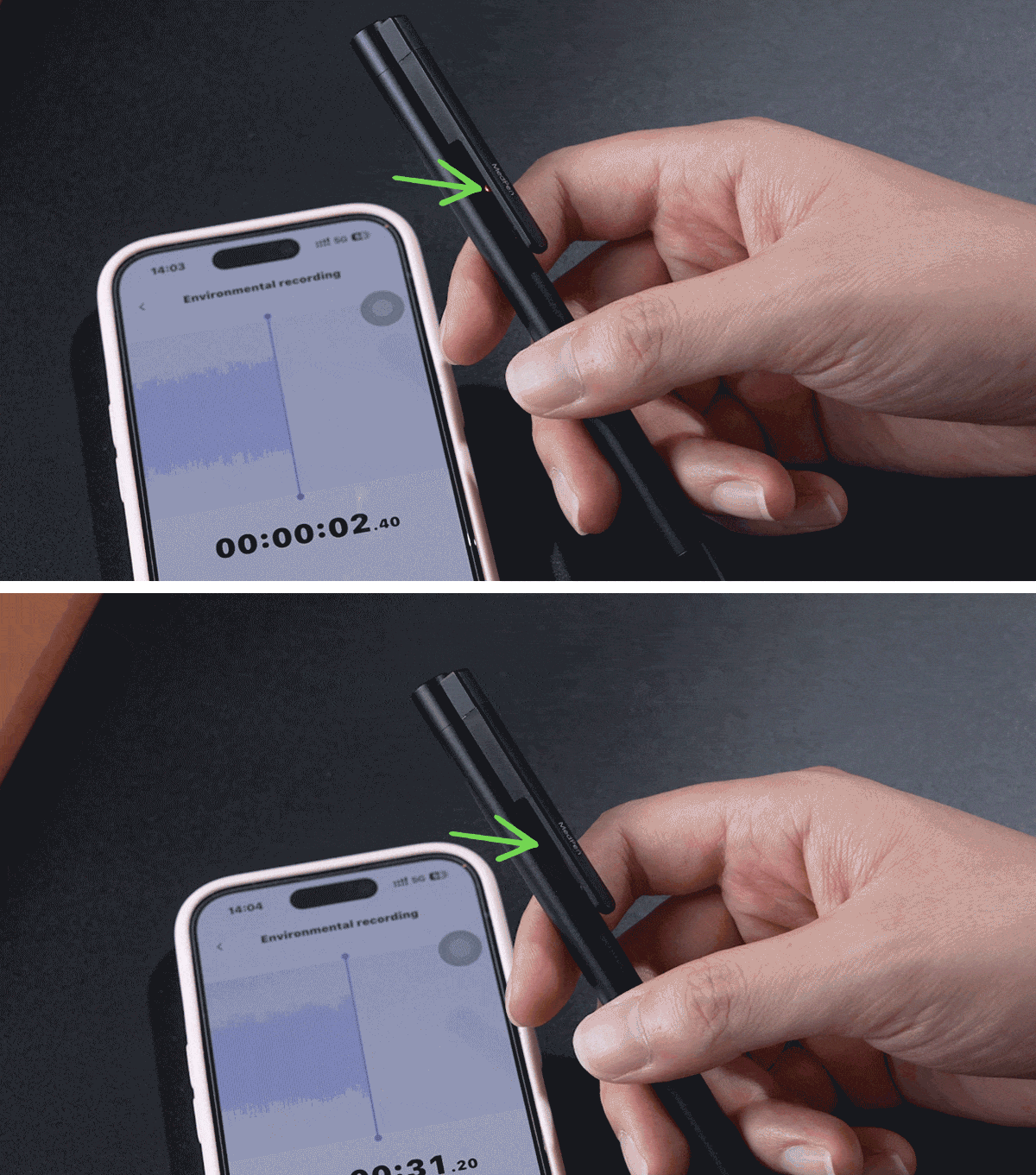 操作ボタンはペンボディと完全に一体化しています。手にしたまま、自然な動きで録音を開始できるため、相手に気づかれることなく、大切な対話をそのままの形で記録します。 |