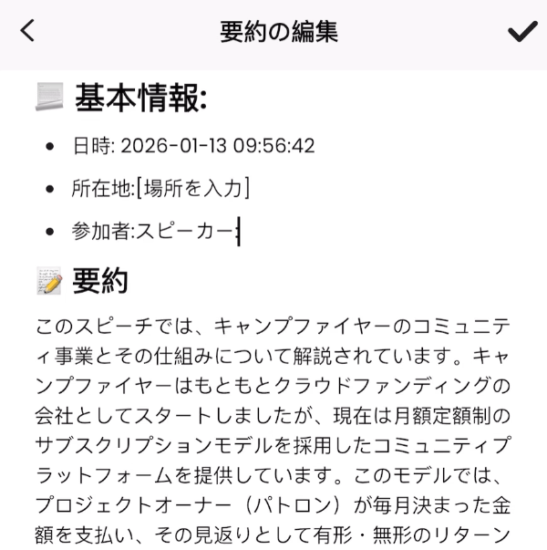 AIが作成した文字起こし文や要約も、あとから自由に編集。誤字修正、要点の追加、文体の統一まで、全てあなたの手で仕上げられます。 |
