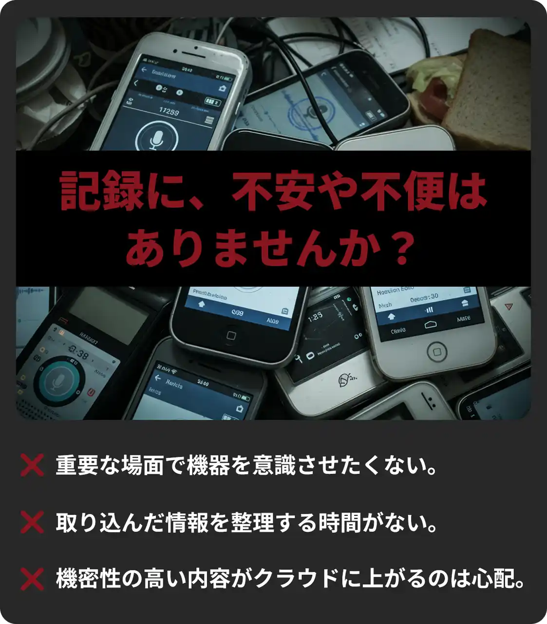 録音した音声は、専用アプリが瞬時に文字起こしと要約を生成。議事録作成の手間を根本から省きます。 |