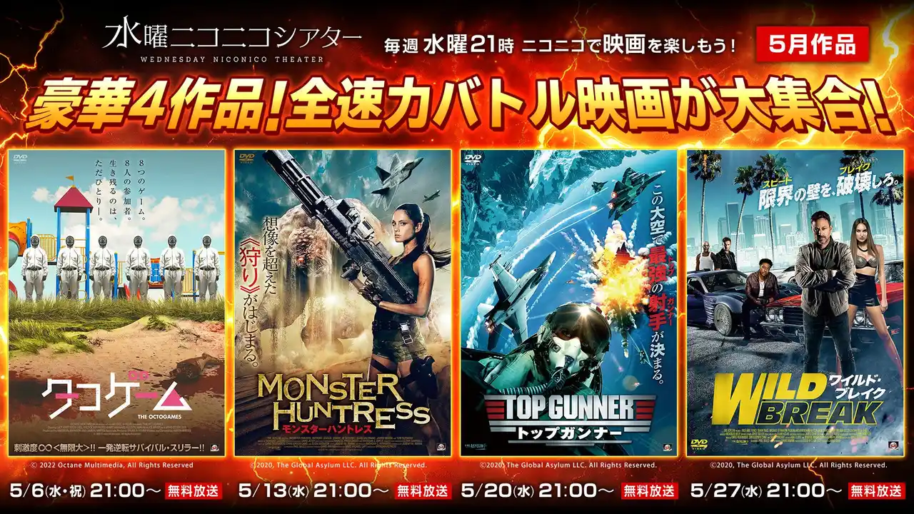 | ニコニコ生放送では、5月6日(水・祝)より映画『タコゲーム』『モンスターハントレス』『トップガンナー』『ワイルド・ブレイク』を毎週無料上映いたします。 |