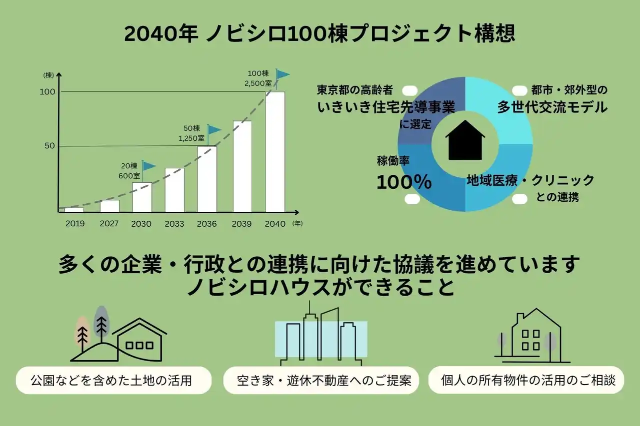 | 今後は、今回開設する「ノビシロハウス東久留米」に続き、当社は2040年に向けて100棟の展開を目指してまいります。高齢化が進む日本社会において、多世代が交流しながら互いに支え合える新しい住まいの形を、より多くの地域へ広げていくことを目指します。 | |||||||||