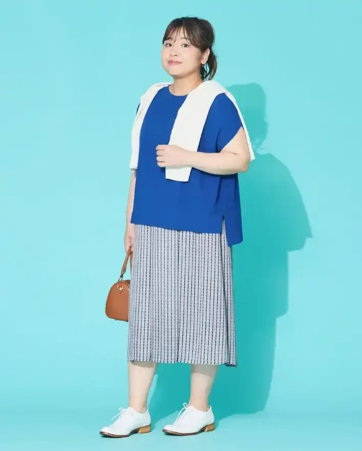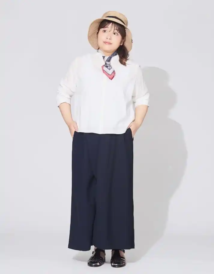 軽やかな素材感と涼しげなカラーを取り入れて初夏のお出かけをもっと楽しく。ほどよいリラックス感と上品さを兼ね備えたスタイルをプラスサイズモデル吉野なおさんが着こなします。 |