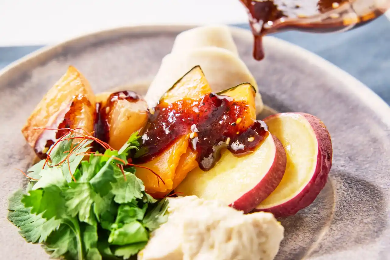 「噛む力に関係なく、誰もがおいしく野菜を楽しめるサラダを届けたい」という想いから、あえて“食感を消す”という逆転の発想で企画しました。蒸すことで引き出される素材の美味しさをシンプルに味わえるサラダです。塩漬けしてから蒸す、蒸した後に揚げるなど、野菜ごとに調理法を使い分けることで、味わいの広がりを持たせました。まずはそのまま素材の味を楽しみ、二口目からは融合自慢の豆鼓黒酢醤油ダレで召し上がっていただくのがおすすめです。 |