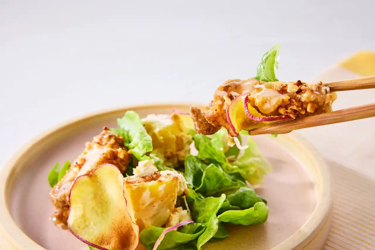 「さつまいもの魅力をより多くの方に伝えたい」という想いから、さつまいもが主役のサラダを考案しました。また、若い世代にもRF1のサラダの魅力を届けたいと考え、アメリカで親しまれている「ワッフルチキン」から着想。香ばしく焼き上げたチキンに、ねっとり食感のさつまいも、メープルシロップの甘さ、クリームチーズのコクを加え、やみつきになる味わいにしあげました。“ザクザク×ねっとり”の食感と、“甘さ×塩味”のバランスにこだわった一品です。 |