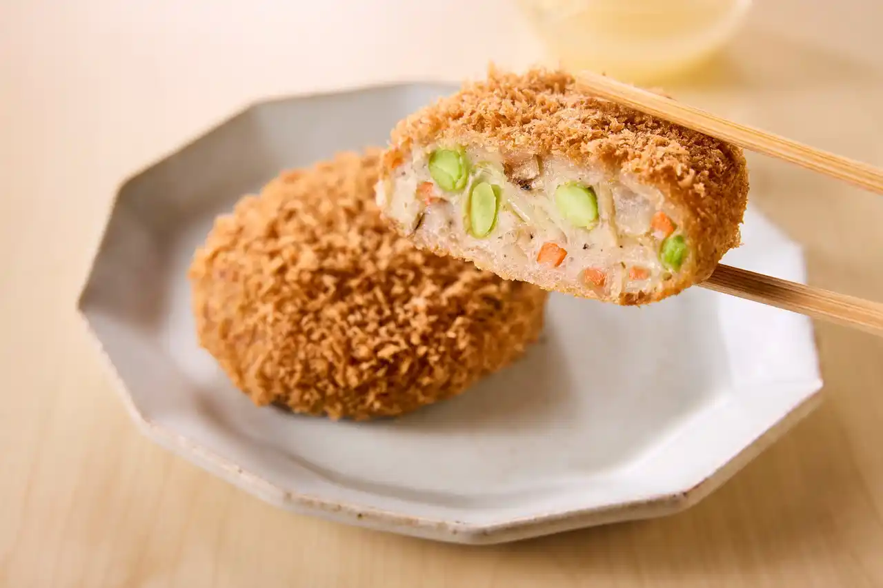 魚介類の不漁や価格高騰が続く中でも、「おいしい海の幸を届けたい」という想いから、愛媛県の郷土料理・じゃこ天をヒントにした商品を企画しました。魚介のすり身に、ごぼう・枝豆・玉ねぎ・人参など食感や彩りの良い野菜を合わせ、素材の旨みを活かしたふっくら軽やかなカツに仕上げています。 |