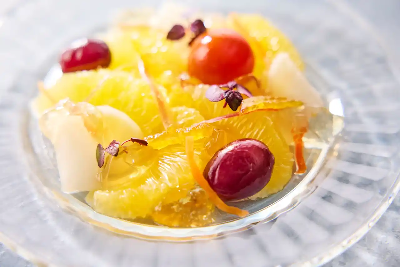 果肉をメインに、皮を使ったマーマレードを合わせ、素材をまるごと味わえます。柚子甘酢と合わせた人参、みょうが、こかぶなどの野菜、トマトやぶどうの浅漬けと一緒にお楽しみください。 |