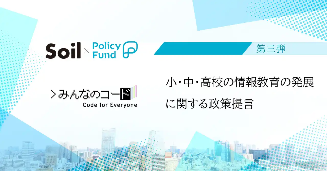 株式会社PoliPoli(東京都千代田区、代表取締役:伊藤和真)は、公益財団法人Soil(東京都渋谷区、代表理事:久田哲史)との共同企画「SoilxPolicy Fund」において、NPO法人みんなのコード(神奈川県横浜市、代表理事:杉之原明子)を2年連続で採択したことをお知らせします。 |