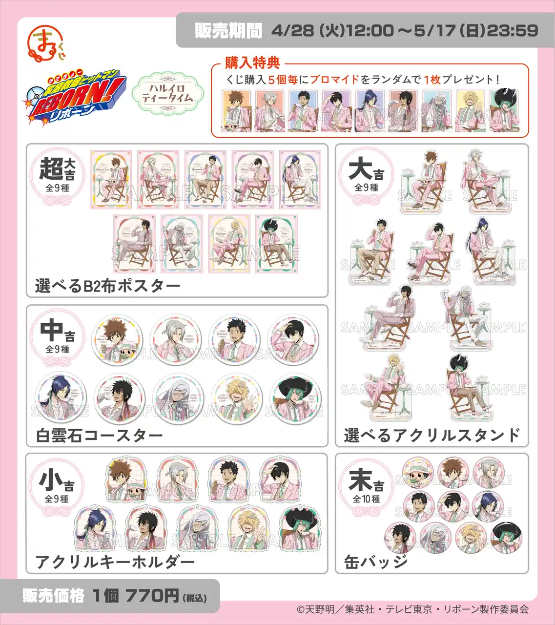 株式会社エディア(本社:東京都千代田区、代表取締役社長:賀島 義成)の子会社、株式会社ティームエンタテインメント(本社:東京都千代田区、代表取締役社長:賀島 義成 以下:ティームエンタテインメント)は、2026年4月28日(火) 12:00よりTVアニメ『家庭教師ヒットマンREBORN!』の新規オリジナルグッズを、インターネットで購入できるオンラインくじサービス『まるくじ』にて販売開始したことをお知らせいたします。 |
