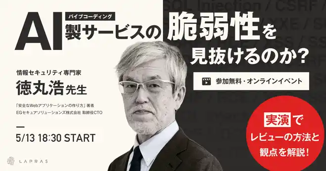 | LAPRAS株式会社(所在地:東京都渋谷区、代表取締役:染谷健太郎 以下、LAPRAS)は、2026年5月13日(水)に、Webアプリケーションセキュリティの第一人者である徳丸 浩氏をゲストに迎え、オンラインイベント「徳丸先生はバイブコーディング製サービスの脆弱性を見抜けるのか」を無料開催いたします。本イベントでは、徳丸氏に完全バイブコーディング(AI生成)で構築されたサービスのセキュリティチェックを実演・解説していただくことで、AI時代における安全なサービス開発のあり方を学べます。 | ||||||||||||