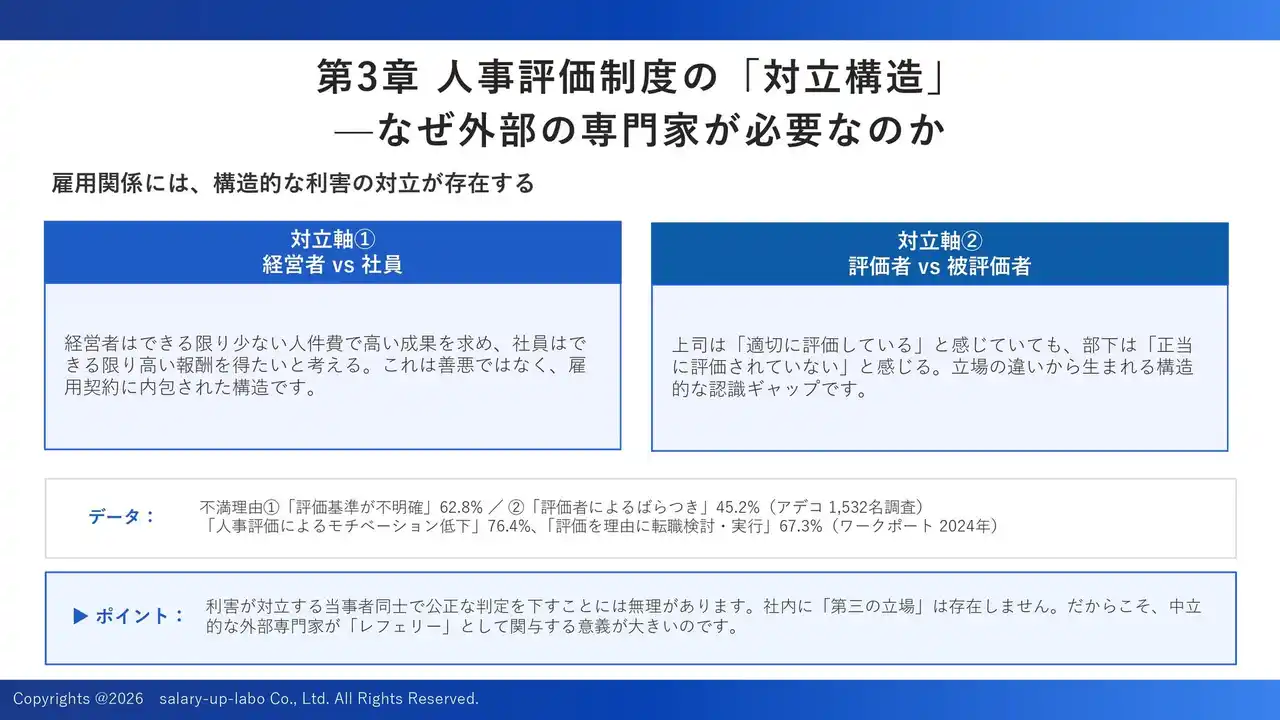本資料ではさらに、人事評価制度の本質として構造的な対立が存在することを解説しています。 |