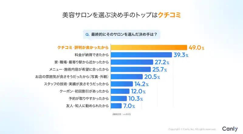 | 来店を決める最大の理由は、料金や立地を抑えて「クチコミ」が1位となっています。 | |||||||||||