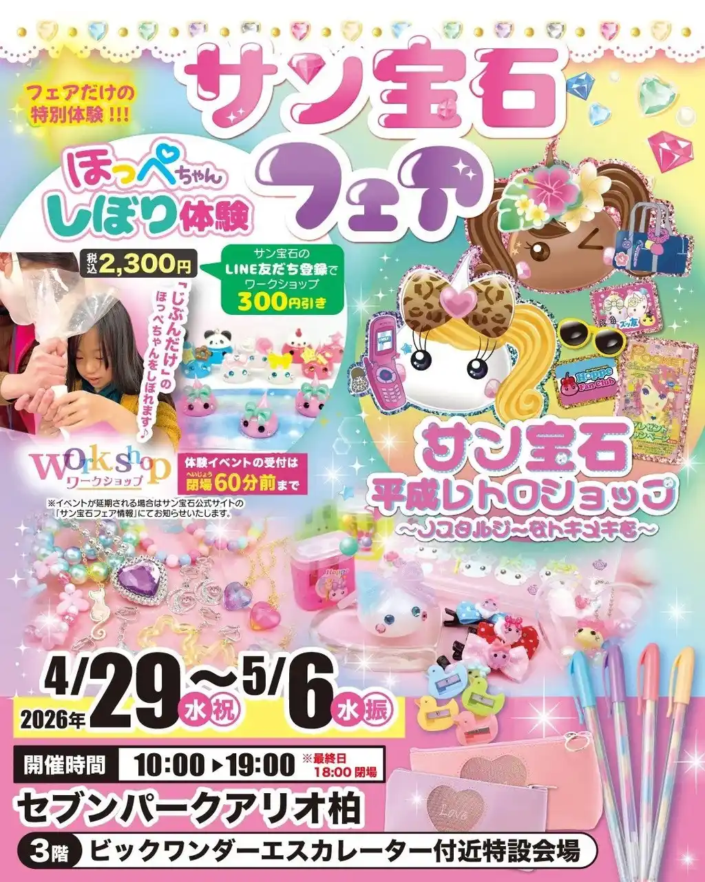 メモリーテックつくば株式会社 インタラクティブコンテンツ事業部 サン宝石(本社:茨城県筑西市、代表取締役社長:鈴木伸也)は、POPUPイベント「サン宝石フェア」を、2026年4月29日(水・祝)から5月6日(水・休)まで、セブンパークアリオ柏(千葉県柏市)3階 ビックワンダーエスカレーター付近特設会場にて開催いたします。 |
